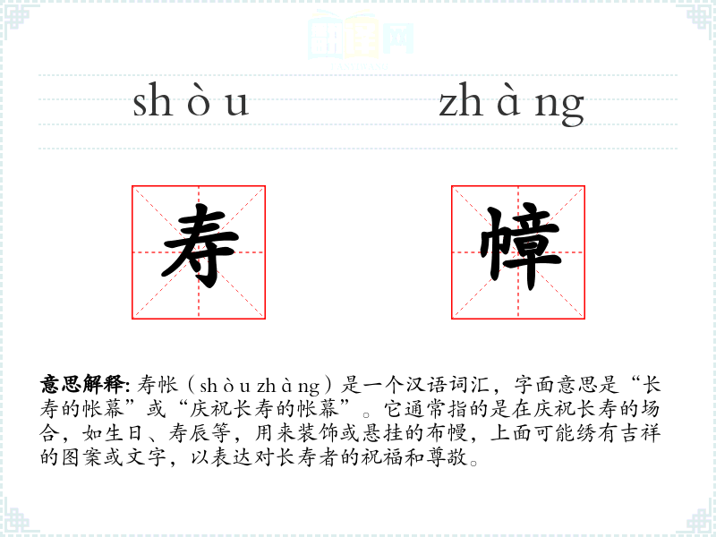 同义词:寿幔、寿帘、寿布 反义词:无直接反义词,但与“丧帐”(用于丧葬的帐幕)形成对比。