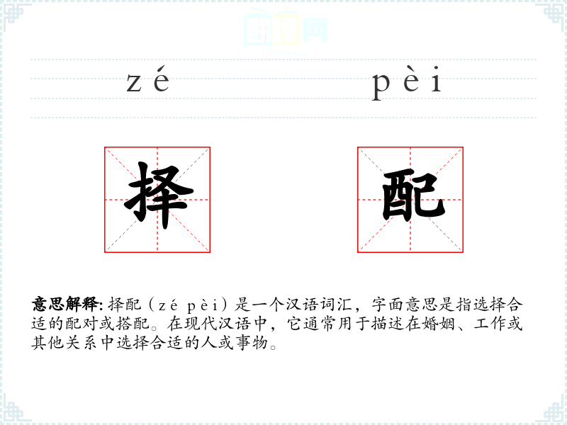 择配(zé pèi)是一个汉语词汇,字面意思是指选择合适的配对或搭配。在现代汉语中,它通常用于描述在婚姻、工作或其他关系中选择合适的人或事物。