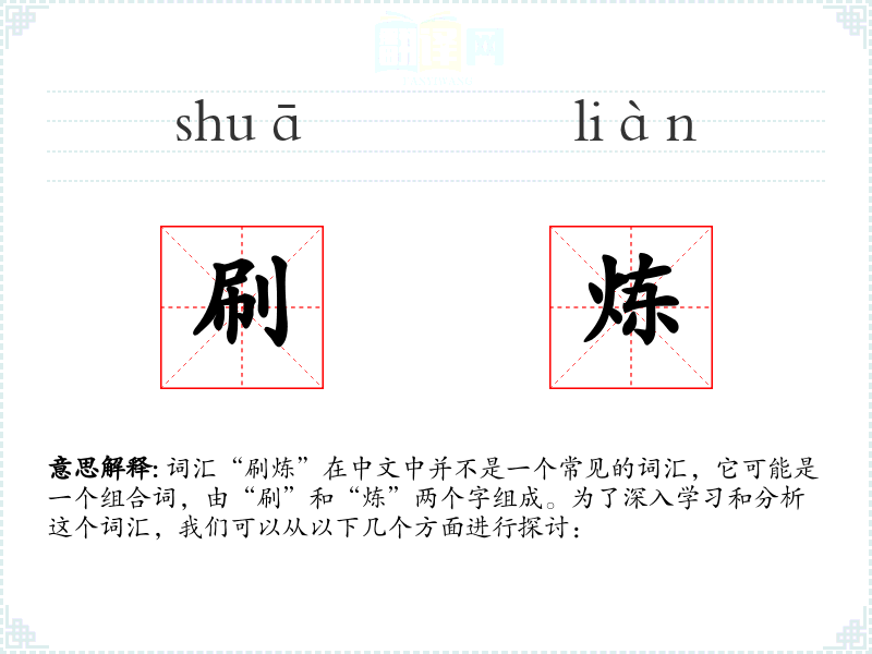 “刷”通常指的是用工具在物体表面移动,以清洁、涂饰或去除某物。而“炼”则常指通过加热等方式使物质纯净或改变其性质。将这两个字组合在一起,“刷炼”可能指的是通过反复的清洁或加工过程,使物体达到更高的纯净度或质量。