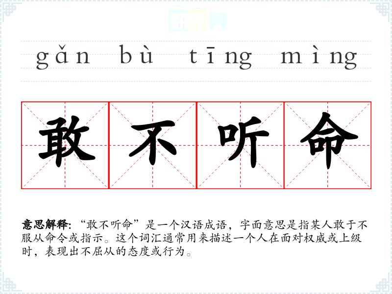 “敢不听命”是一个汉语成语,字面意思是指某人敢于不服从命令或指示。这个词汇通常用来描述一个人在面对权威或上级时,表现出不屈从的态度或行为。