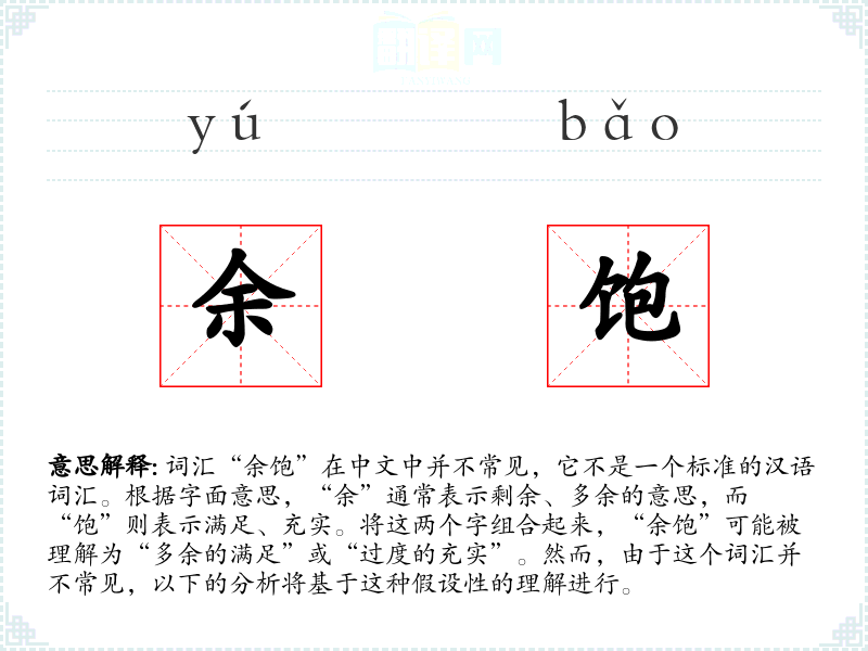 词汇“余饱”在中文中并不常见,它不是一个标准的汉语词汇。根据字面意思,“余”通常表示剩余、多余的意思,而“饱”则表示满足、充实。将这两个字组合起来,“余饱”可能被理解为“多余的满足”或“过度的充实”。然而,由于这个词汇并不常见,以下的分析将基于这种假设性的理解进行。