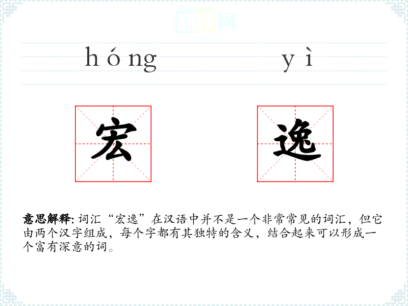 - 词源:“宏”和“逸”都是古代汉语中就有的词汇,它们的组合可能是现代汉语中形成的复合词。