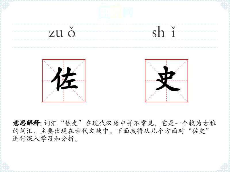 由于“佐史”是一个较为古雅的词汇,现代生活中很少有机会使用。在研究古代历史或文学时,可能会遇到这个词汇。