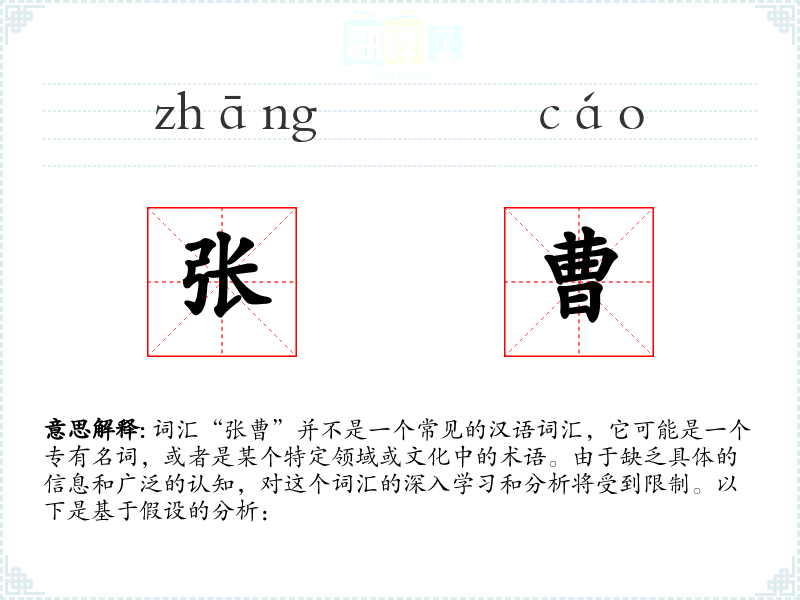 由于“张曹”不是一个通用词汇,对其的理解和应用将非常有限。在语言学*和表达中,了解特定词汇的背景和语境是非常重要的。对于不常见的词汇,深入研究其来源和用法可以增加语言的丰富性和准确性。