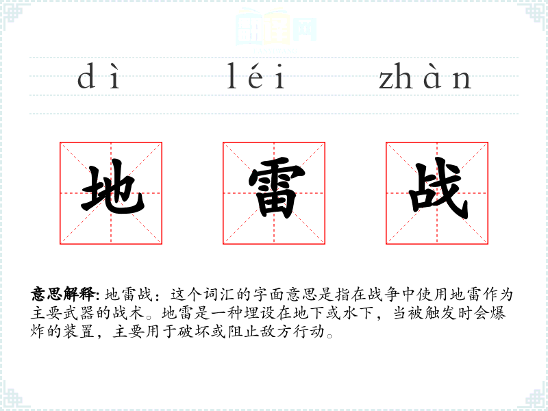 地雷战:这个词汇的字面意思是指在战争中使用地雷作为主要武器的战术。地雷是一种埋设在地下或水下,当被触发时会爆炸的装置,主要用于破坏或阻止敌方行动。