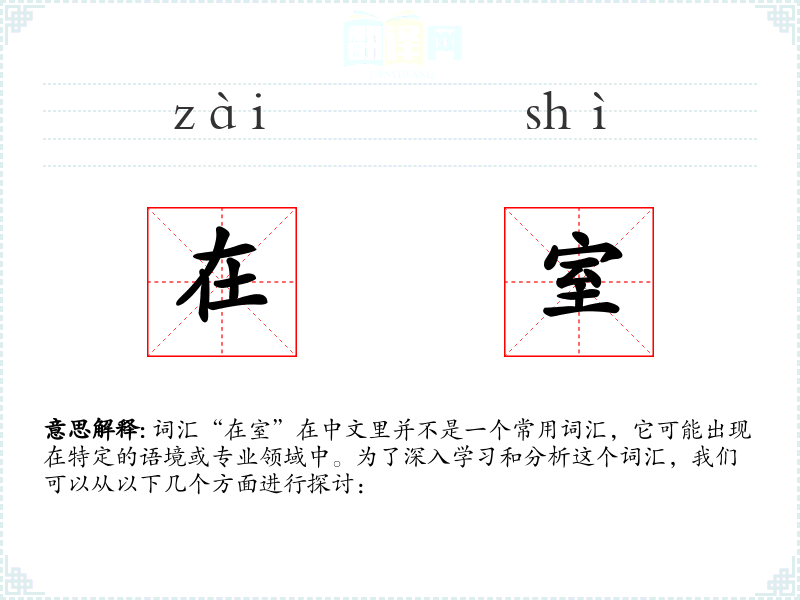词汇“在室”在中文里并不是一个常用词汇,它可能出现在特定的语境或专业领域中。为了深入学习和分析这个词汇,我们可以从以下几个方面进行探讨: