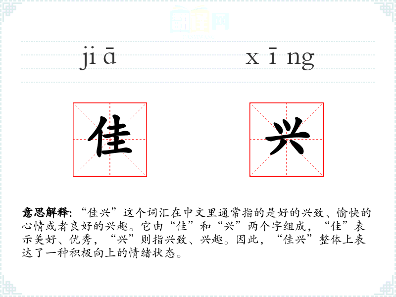 - 专业领域:在心理学或情绪研究中,“佳兴”可能被用来描述一种积极的情绪状态。