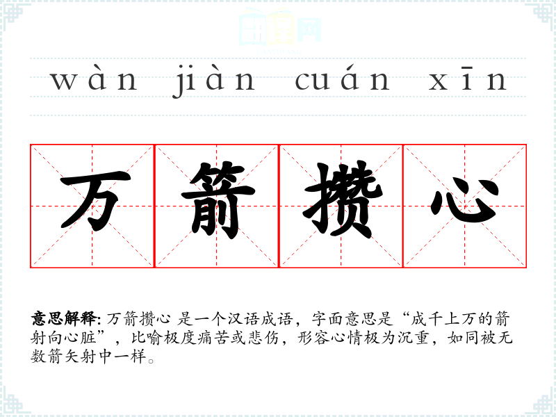 万箭攒心 是一个汉语成语,字面意思是“成千上万的箭射向心脏”,比喻极度痛苦或悲伤,形容心情极为沉重,如同被无数箭矢射中一样。