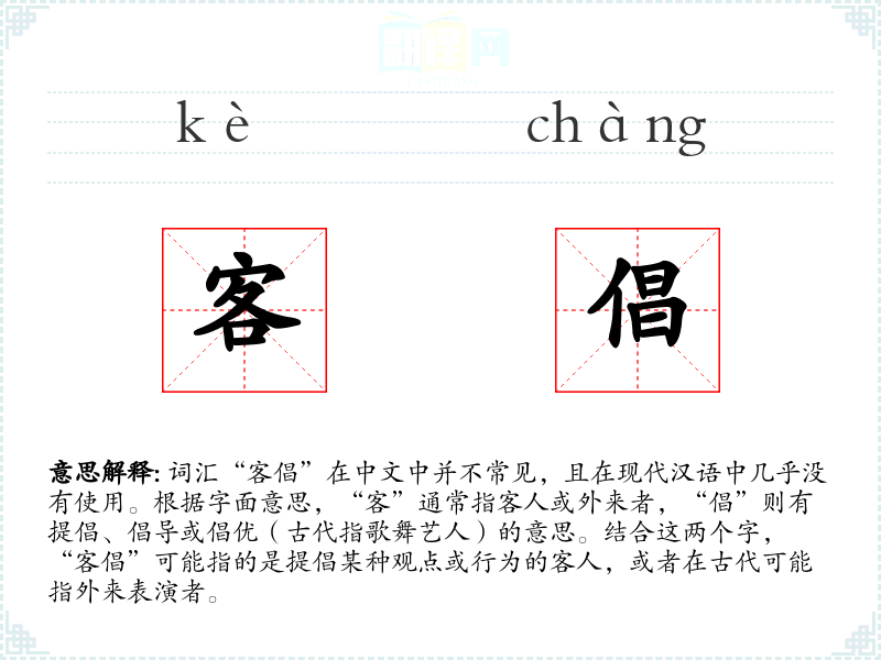 - 词源:“客”和“倡”均为古代汉语词汇,结合使用的情况较少见。