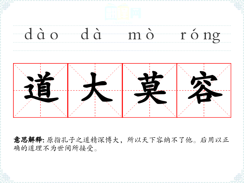 原指孔子之道精深博大,所以天下容纳不了他。后用以正确的道理不为世间所接受。