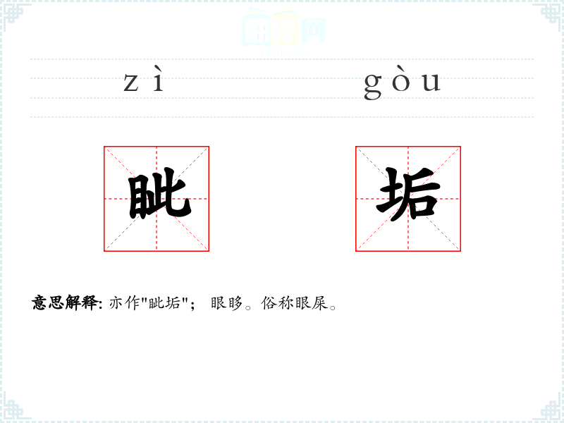 亦作"眦垢"; 眼眵。俗称眼屎。