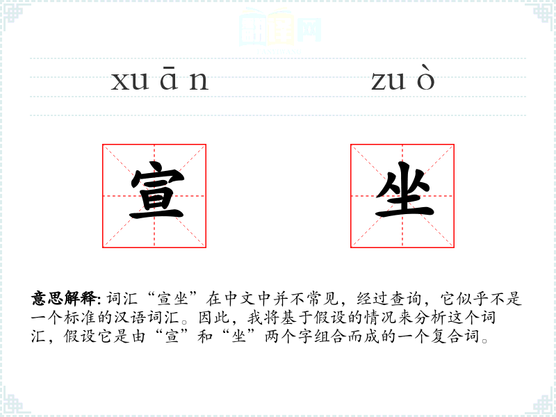 词汇“宣坐”在中文中并不常见,经过查询,它似乎不是一个标准的汉语词汇。因此,我将基于假设的情况来分析这个词汇,假设它是由“宣”和“坐”两个字组合而成的一个复合词。