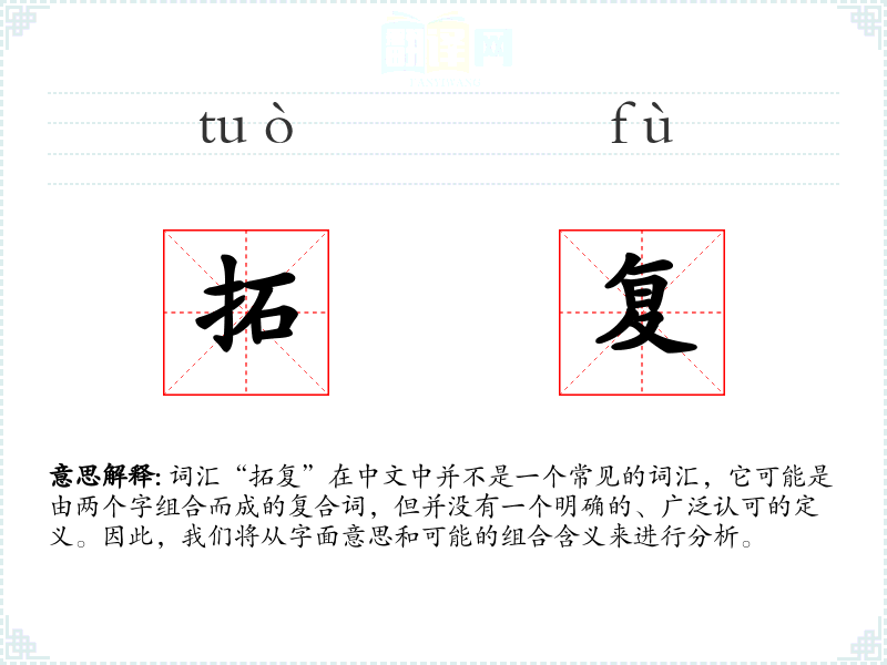 词汇“拓复”在中文中并不是一个常见的词汇,它可能是由两个字组合而成的复合词,但并没有一个明确的、广泛认可的定义。因此,我们将从字面意思和可能的组合含义来进行分析。