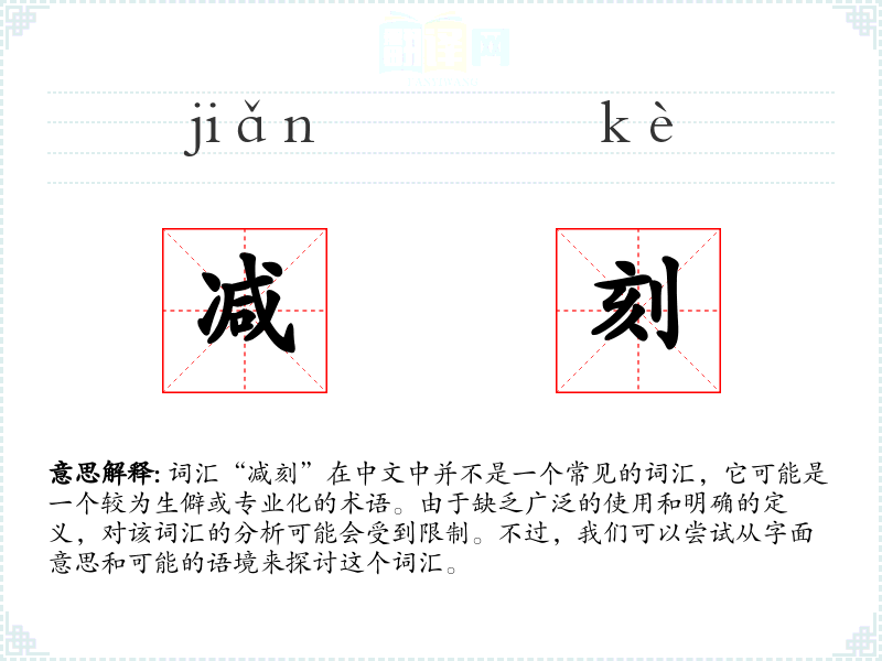 词汇“减刻”在中文中并不是一个常见的词汇,它可能是一个较为生僻或专业化的术语。由于缺乏广泛的使用和明确的定义,对该词汇的分析可能会受到限制。不过,我们可以尝试从字面意思和可能的语境来探讨这个词汇。