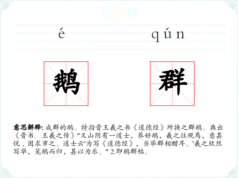 1.成群的鹅。特指晋王羲之书《道德经》所换之群鹅。典出《晋书.王羲之传》"又山阴有一道士,养好鹅,羲之往观焉,意甚悦﹐固求市之。道士云'为写《道德经》,当举群相赠耳。'羲之欣然写毕,笼鹅而归,甚以为乐。" 2.即鹅群帖。