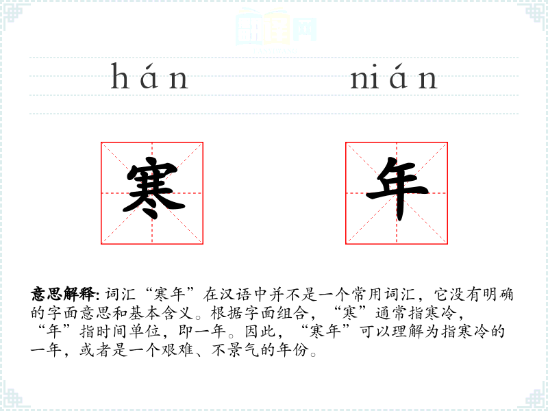 由于“寒年”不是一个常用词汇,它的词源和历史演变并不明确。它可能是由“寒”和“年”两个常用词汇组合而成,用来形容特定的情况。