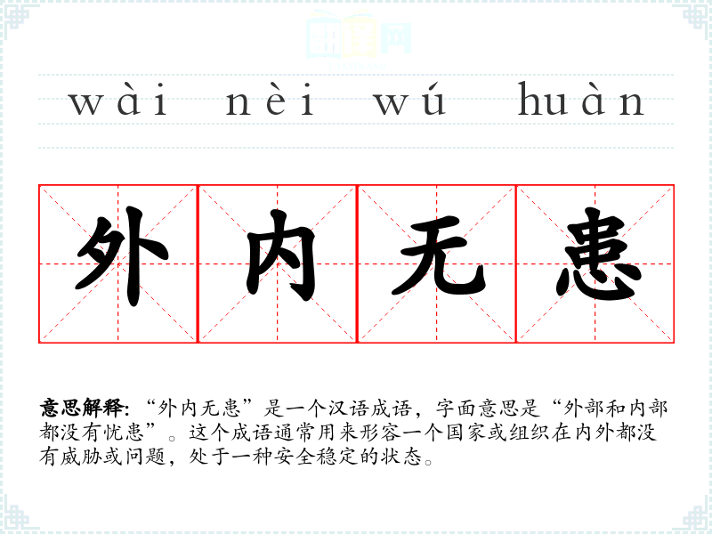“外内无患”是一个汉语成语,字面意思是“外部和内部都没有忧患”。这个成语通常用来形容一个国家或组织在内外都没有威胁或问题,处于一种安全稳定的状态。