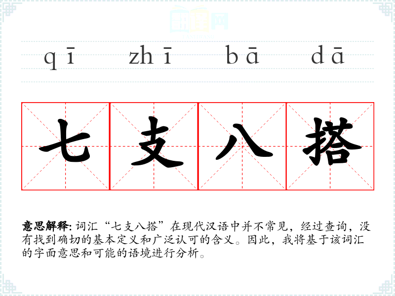 词汇“七支八搭”在现代汉语中并不常见,经过查询,没有找到确切的基本定义和广泛认可的含义。因此,我将基于该词汇的字面意思和可能的语境进行分析。