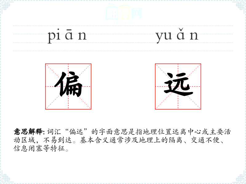 词汇“偏远”的字面意思是指地理位置远离中心或主要活动区域,不易到达。基本含义通常涉及地理上的隔离、交通不便、信息闭塞等特征。