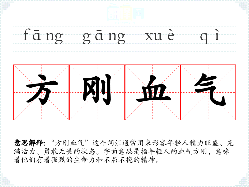“方刚血气”这个词汇通常用来形容年轻人精力旺盛、充满活力、勇敢无畏的状态。字面意思是指年轻人的血气方刚,意味着他们有着强烈的生命力和不屈不挠的精神。