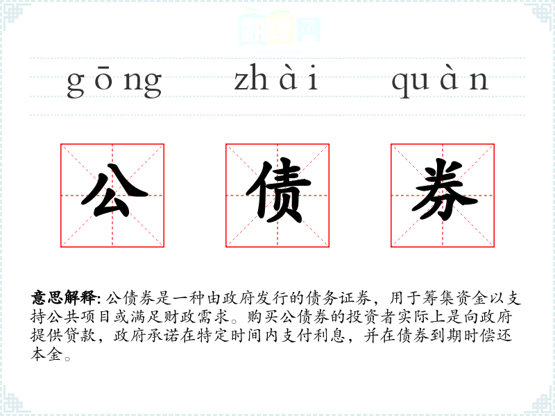 - 反义词:企业债券(由企业发行,风险和回报通常高于公债券)