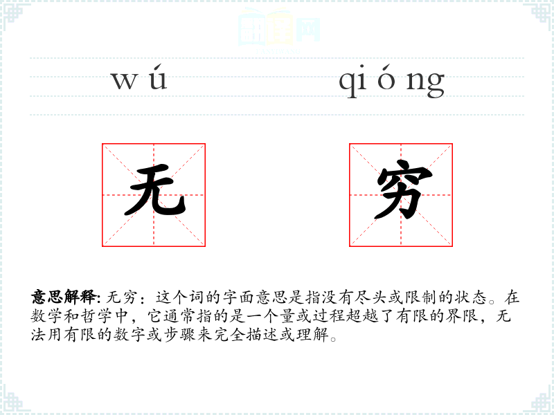 无穷:这个词的字面意思是指没有尽头或限制的状态。在数学和哲学中,它通常指的是一个量或过程超越了有限的界限,无法用有限的数字或步骤来完全描述或理解。