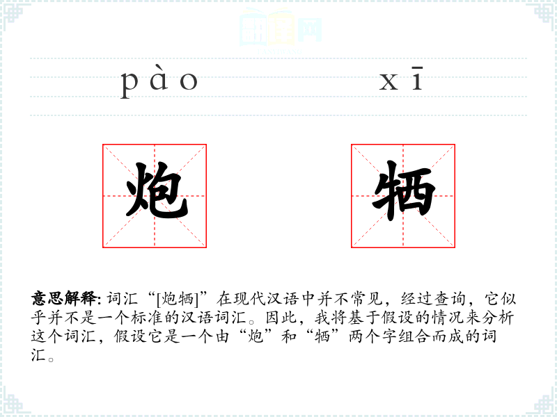 词汇“[炮牺]”在现代汉语中并不常见,经过查询,它似乎并不是一个标准的汉语词汇。因此,我将基于假设的情况来分析这个词汇,假设它是一个由“炮”和“牺”两个字组合而成的词汇。