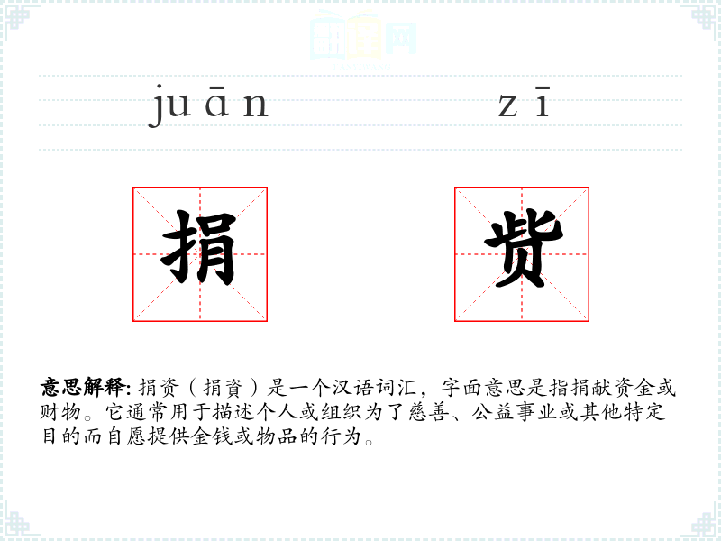 捐资(捐資)是一个汉语词汇,字面意思是指捐献资金或财物。它通常用于描述个人或组织为了慈善、公益事业或其他特定目的而自愿提供金钱或物品的行为。