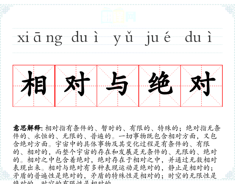 相对指有条件的、暂时的、有限的、特殊的;绝对指无条件的、永恒的、无限的、普遍的。一切事物既包含相对方面,又包含绝对方面。宇宙中的具体事物及其变化过程是有条件的、有限的、相对的,而整个宇宙的存在和发展是无条件的、无限的、绝对的。相对之中包含着绝对,绝对存在于相对之中,并通过无数相对表现出来。相对与绝对有多种表现运动是绝对的,静止是相对的;矛盾的普遍性是绝对的,矛盾的特殊性是相对的;时空的无限性是绝对的,时空的有限性是相对的。