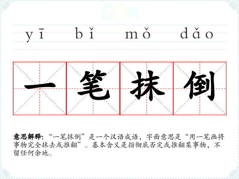 “一笔抹倒”是一个汉语成语,字面意思是“用一笔画将事物完全抹去或推翻”。基本含义是指彻底否定或推翻某事物,不留任何余地。