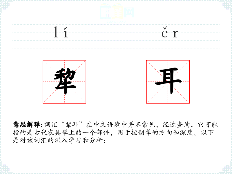 词汇“犂耳”在中文语境中并不常见,经过查询,它可能指的是古代农具犁上的一个部件,用于控制犁的方向和深度。以下是对该词汇的深入学*和分析: