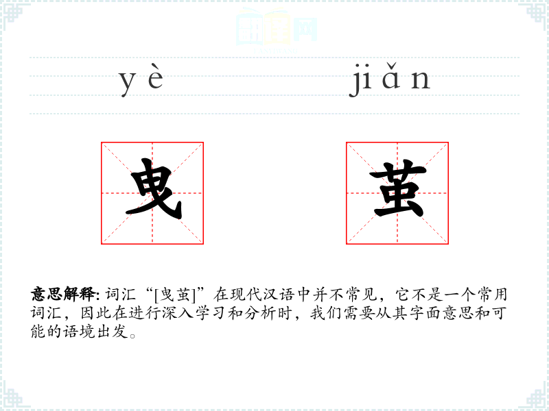 词汇“[曳茧]”在现代汉语中并不常见,它不是一个常用词汇,因此在进行深入学*和分析时,我们需要从其字面意思和可能的语境出发。