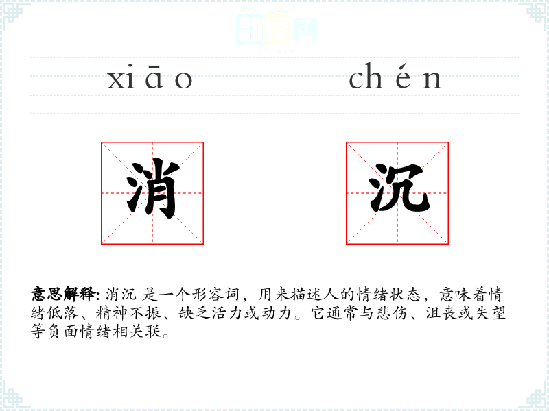 消沉 是一个形容词,用来描述人的情绪状态,意味着情绪低落、精神不振、缺乏活力或动力。它通常与悲伤、沮丧或失望等负面情绪相关联。