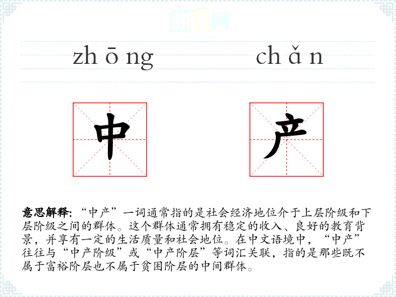 “中产”一词通常指的是社会经济地位介于上层阶级和下层阶级之间的群体。这个群体通常拥有稳定的收入、良好的教育背景,并享有一定的生活质量和社会地位。在中文语境中,“中产”往往与“中产阶级”或“中产阶层”等词汇关联,指的是那些既不属于富裕阶层也不属于贫困阶层的中间群体。