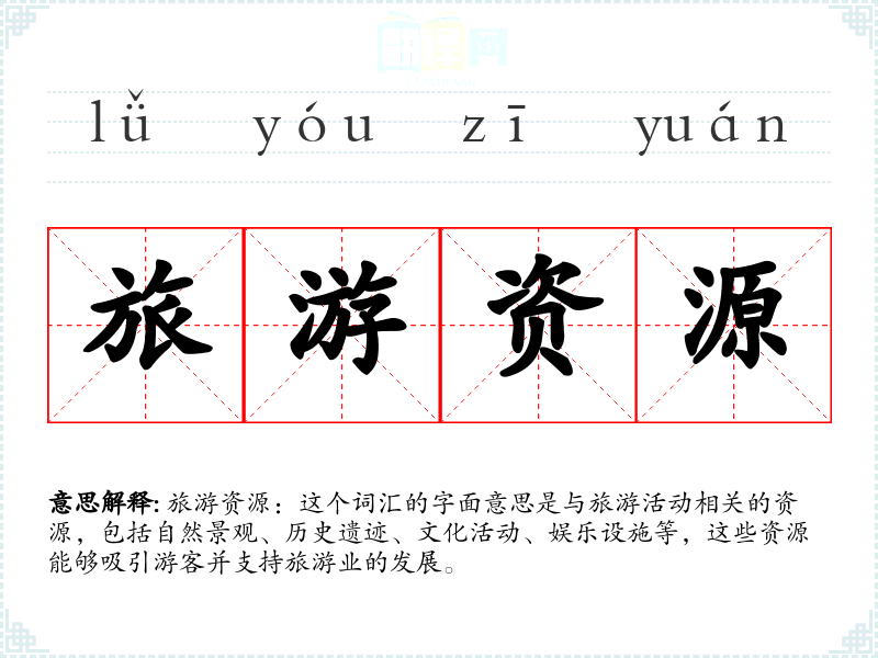 旅游资源:这个词汇的字面意思是与旅游活动相关的资源,包括自然景观、历史遗迹、文化活动、娱乐设施等,这些资源能够吸引游客并支持旅游业的发展。