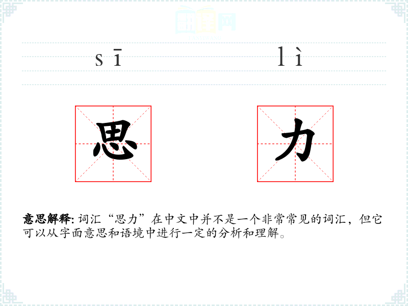 “思力”这个词可能是由“思”和“力”两个字组合而成,其中“思”指的是思考,“力”指的是能力或力量。在古代文献中,类似的表达可能更多地使用“智慧”或“才智”等词汇。
