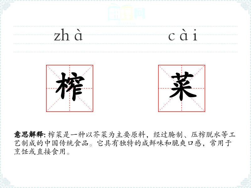 - 反义词:新鲜蔬菜(榨菜是经过加工的,而新鲜蔬菜是未经处理的)