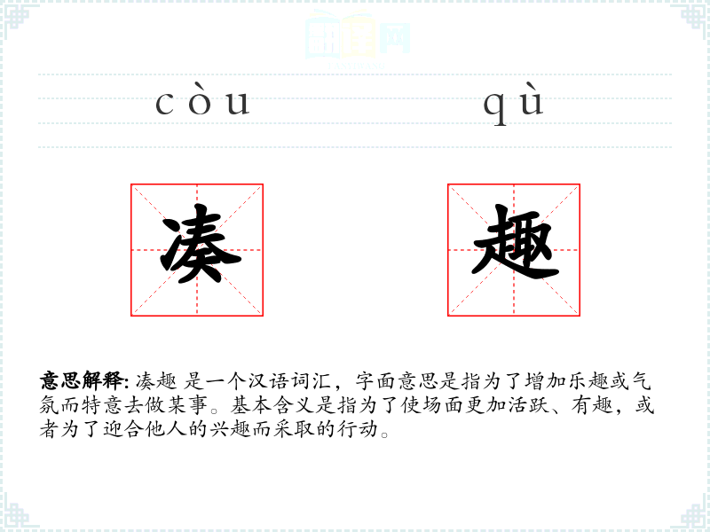 凑趣 是一个汉语词汇,字面意思是指为了增加乐趣或气氛而特意去做某事。基本含义是指为了使场面更加活跃、有趣,或者为了迎合他人的兴趣而采取的行动。