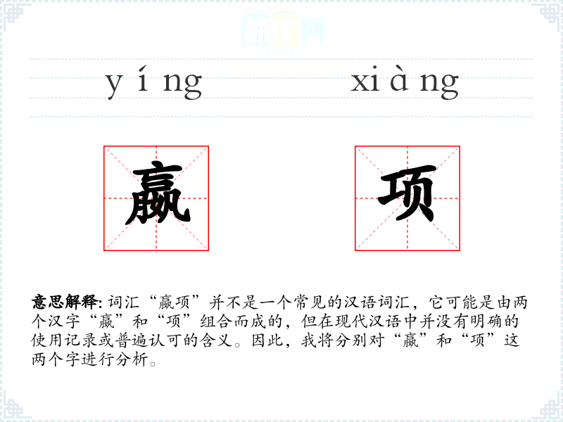词汇“嬴项”并不是一个常见的汉语词汇,它可能是由两个汉字“嬴”和“项”组合而成的,但在现代汉语中并没有明确的使用记录或普遍认可的含义。因此,我将分别对“嬴”和“项”这两个字进行分析。