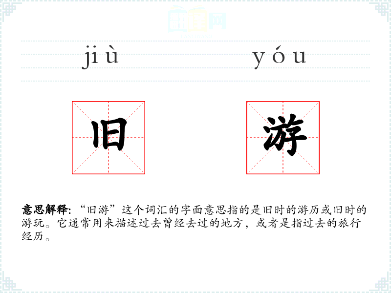 “旧游”这个词汇的词源较为简单,由“旧”和“游”两个字组成。在古代汉语中,“游”字有游历、游玩的意思,而“旧”字则表示过去的时间。随着时间的推移,这个词汇的含义和用法基本保持稳定。