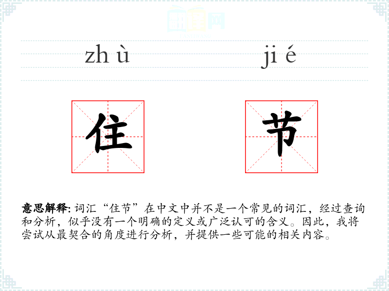 由于“住节”不是一个标准词汇,我们无法提供一个确切的基本定义。它可能是某个特定领域或方言中的词汇,或者是某个特定语境下的临时组合词。