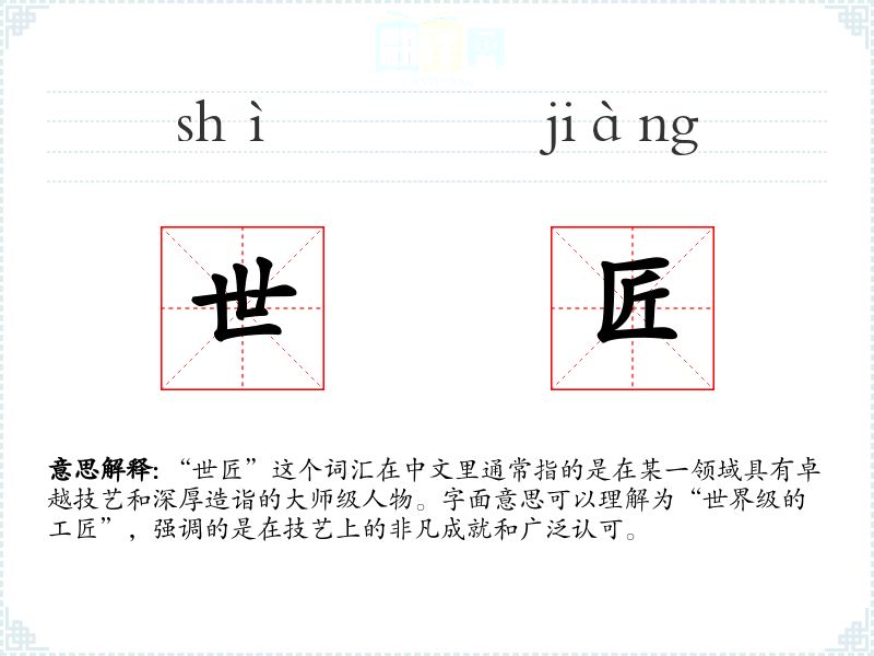 “世匠”这个词汇的词源较为直接,由“世”(世界)和“匠”(工匠)组成,强调的是在全球范围内的技艺认可。在历史上,这个词汇可能更多用于手工艺人,但随着时代的发展,它的应用范围已经扩展到各个专业领域。