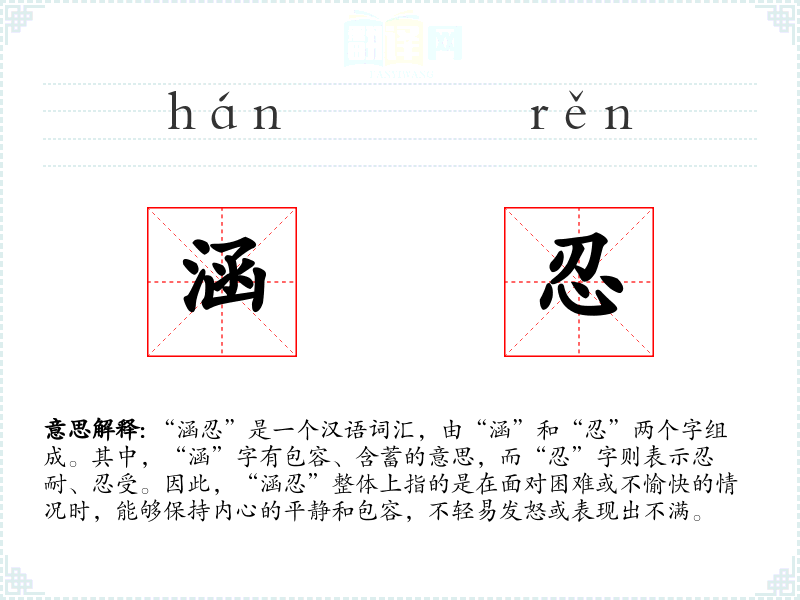 “涵忍”是一个汉语词汇,由“涵”和“忍”两个字组成。其中,“涵”字有包容、含蓄的意思,而“忍”字则表示忍耐、忍受。因此,“涵忍”整体上指的是在面对困难或不愉快的情况时,能够保持内心的平静和包容,不轻易发怒或表现出不满。