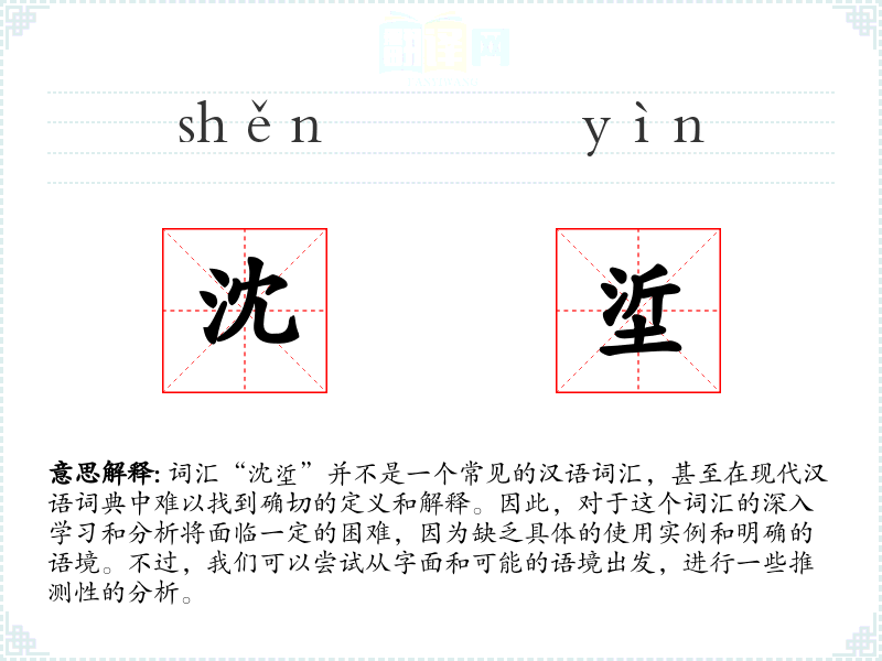 由于“沈垽”不是一个标准词汇,我们无法给出确切的字面意思和基本含义。从字形上看,“沈”可能与“沉”有关,表示下沉或深沉的意思;“垽”字较为生僻,可能与沉淀物或沉积有关。
