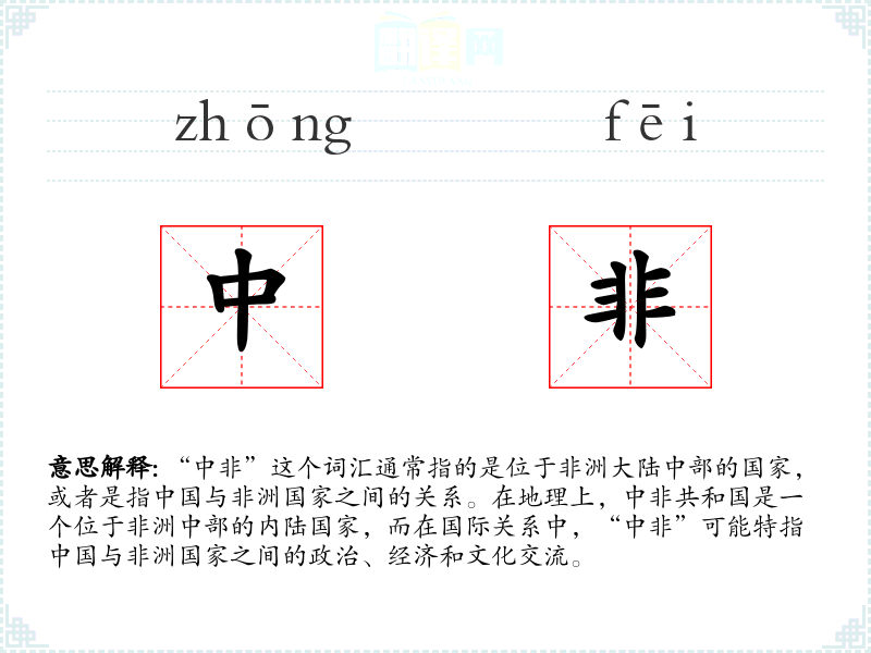 在不同语言中,“中非”可能被翻译为不同的词汇,但其核心含义保持一致。例如,在法语中,“中非”可能被翻译为“Afrique centrale”。