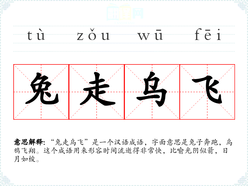 “兔走乌飞”是一个汉语成语,字面意思是兔子奔跑,乌鸦飞翔。这个成语用来形容时间流逝得非常快,比喻光阴似箭,日月如梭。