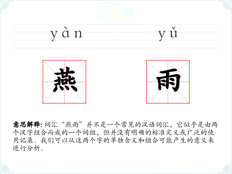 词汇“燕雨”并不是一个常见的汉语词汇,它似乎是由两个汉字组合而成的一个词组,但并没有明确的标准定义或广泛的使用记录。我们可以从这两个字的单独含义和组合可能产生的意义来进行分析。
