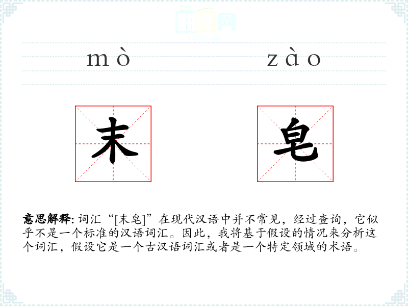词汇“[末皂]”在现代汉语中并不常见,经过查询,它似乎不是一个标准的汉语词汇。因此,我将基于假设的情况来分析这个词汇,假设它是一个古汉语词汇或者是一个特定领域的术语。