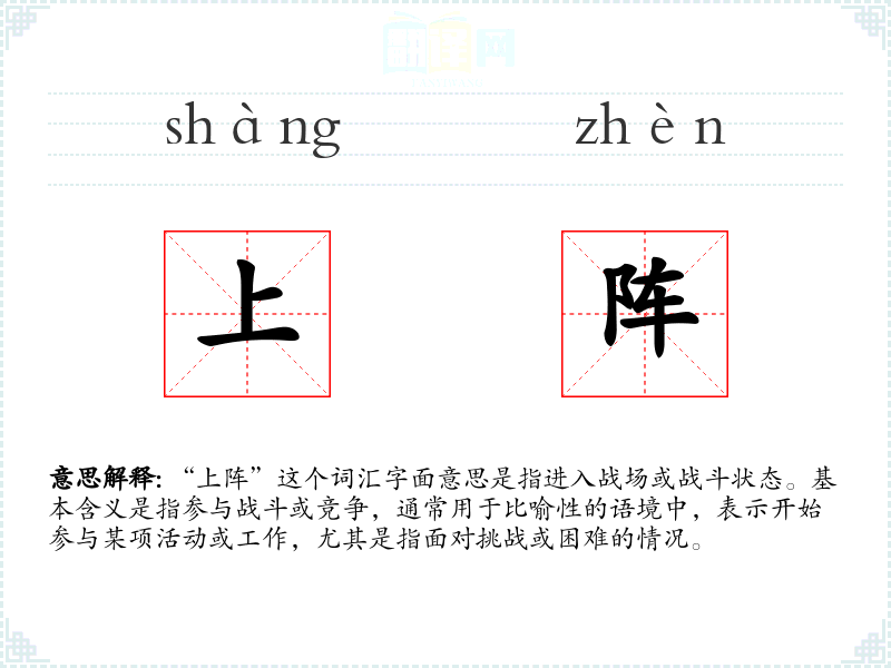 “上阵”这个词汇字面意思是指进入战场或战斗状态。基本含义是指参与战斗或竞争,通常用于比喻性的语境中,表示开始参与某项活动或工作,尤其是指面对挑战或困难的情况。