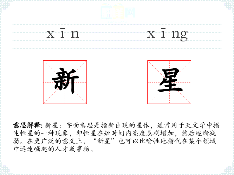 新星:字面意思是指新出现的星体,通常用于天文学中描述恒星的一种现象,即恒星在短时间内亮度急剧增加,然后逐渐减弱。在更广泛的意义上,“新星”也可以比喻性地指代在某个领域中迅速崛起的人才或事物。